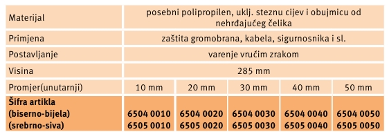 Okrugla zaštita za cijev od posebnog polipropilen, uključuje steznu cijev i obujmicu od nehrđajućeg čelika. Primjenjuje se kao zaštita gromobrana, kabela, sigurnosnika i sl., postavlja se varenjem s vrućim zrakom. Promjera 40mm.