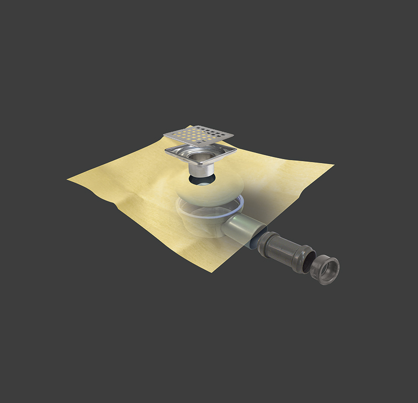 Sifonski komplet za odvod (konvertibilan u nesifonski) za tuševe izrađene po mjeri s HORIZONTALNIM izlazom od 50 mm, smanjenim na 40 mm, s toplinski zapečaćenom vodootpornom membranom tipa DRY40 (25×25 cm) pričvršćenom na poklopac. Također uključuje labavu membranu DRY40 (1,5x2m, 3m²) za potpunu hidroizolaciju tuša.